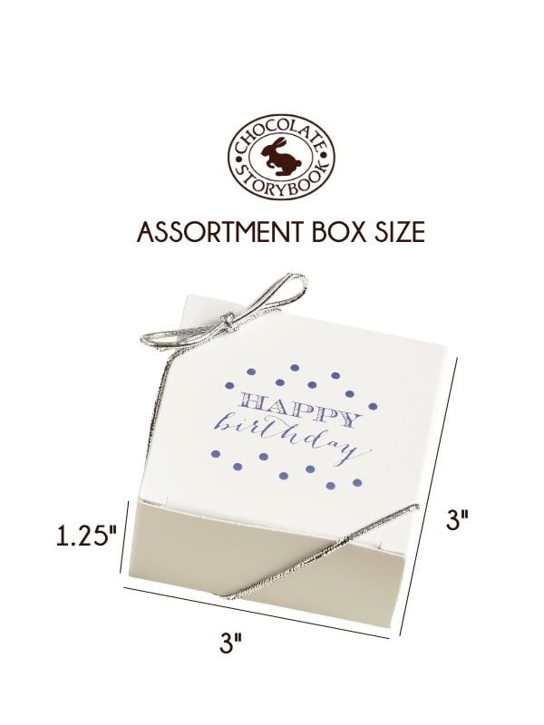 Make any birthday sweeter with our 4-piece chocolate favor box. Each box holds a milk chocolate caramel, milk chocolate peanut butter smoothie, dark chocolate buttercream, and gold foil-wrapped milk chocolate. Beautifully packaged in a white box with a stretch-band bow, it is the perfect little indulgence for guests, friends, or party tables. Box size: 3″ x 3″ x 1.25″