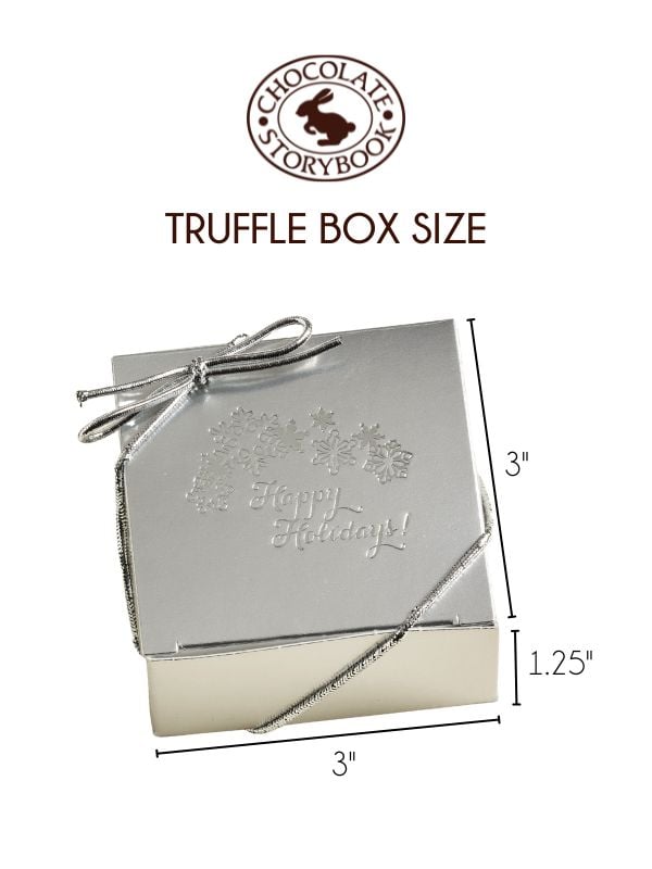 Celebrate the season with our 4pc Holiday Truffles Assortment, the perfect way to share joy, warmth, and a touch of indulgence. This festive assortment features milk, dark, and white bite-sized chocolate truffles filled with rich, smooth, and creamy centers in four decadent flavors: Caramel, Chocolate, Champagne and Tiramisu. Truffles are packed in a silver embossed gift box and secured with a silver stretch-band bow. Whether you’re gifting clients, friends, or family, these truffles make a sophisticated and memorable way to say “Happy Holidays.”