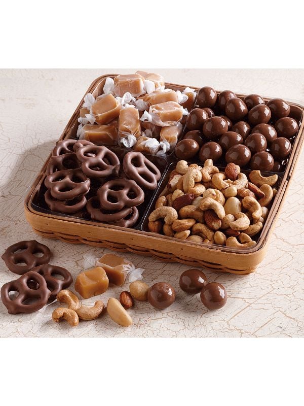 Treat them to a little of everything with our Four-Square Sampler, featuring a delicious combination of creamy confections and premium roasted nuts. Each section offers a crowd-pleasing favorite, beautifully arranged in a chipwood basket.