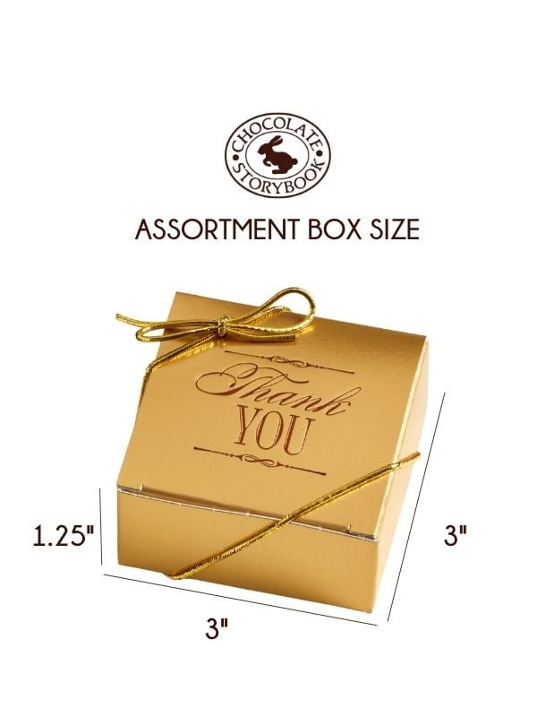 Make every thank-you moment more memorable with our 4-piece chocolate favor box. Each box includes a milk chocolate caramel, milk chocolate peanut butter smoothie, dark chocolate buttercream, and gold foil-wrapped milk chocolate. Elegantly packaged in a gold box with a gold stretch-band bow, it is the perfect small gift to show appreciation to clients, guests, or loved ones. Box size: 3″ x 3″ x 1.25″