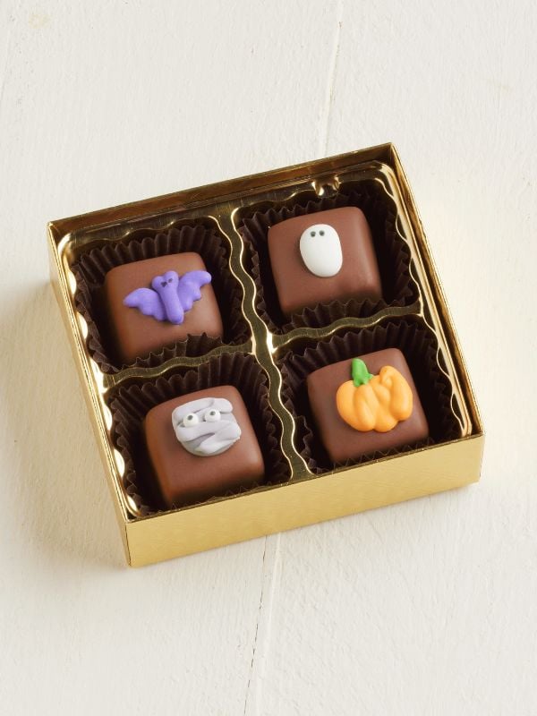 Indulge your spooky sweet tooth with our sweet Halloween caramels. This frightfully delicious set includes 9 or 4 milk chocolate caramels, each hand-decorated with fun, ghoulish Halloween designs. Our buttery caramels are made in small batches using traditional methods in an open copper kettle, then enrobed in creamy milk chocolate for a rich, velvety taste. It’s carefully packaged in an elegant box with a clear lid and secured with a gold stretch band. This collection is perfect for sharing at Halloween parties or enjoying as a spooky treat for yourself!
