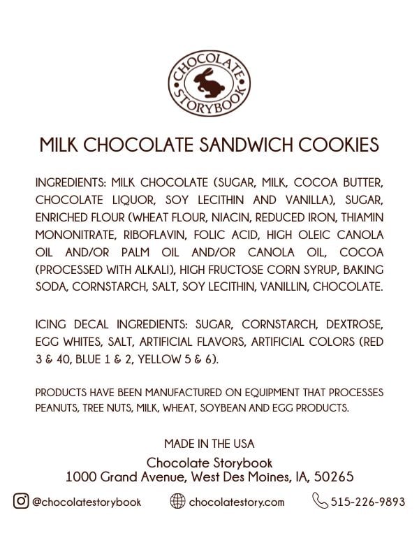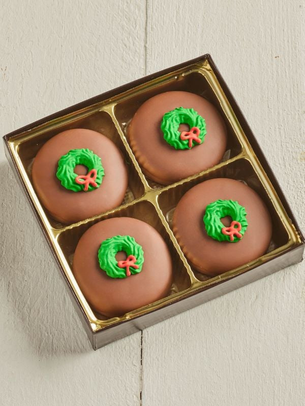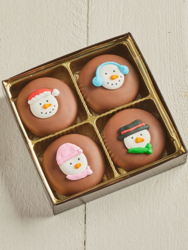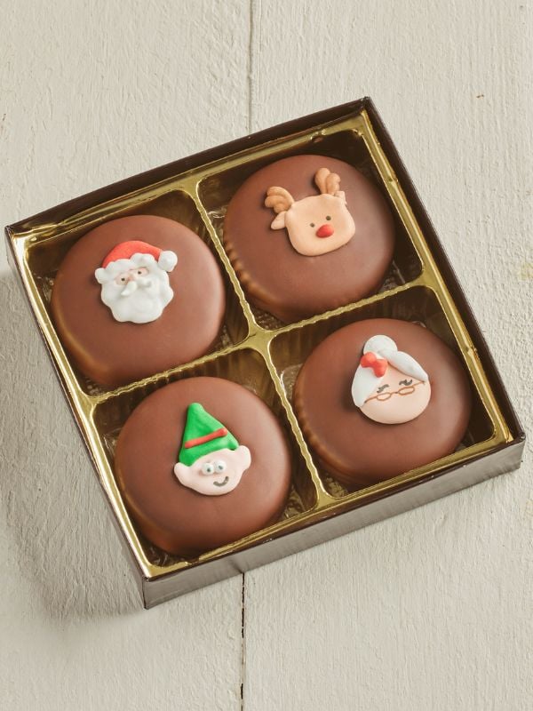 Your friends and family will smile with delight when they see these gourmet holiday sandwich cookies. We start with creamy chocolate sandwich cookies, dunked in pure milk chocolate and topped with a festive holiday icing decal. Carefully packaged in an elegant box with a clear lid and secured with a gold stretch band, they’re perfect for gifting or indulging in yourself. Box measures 6″x6″x1″